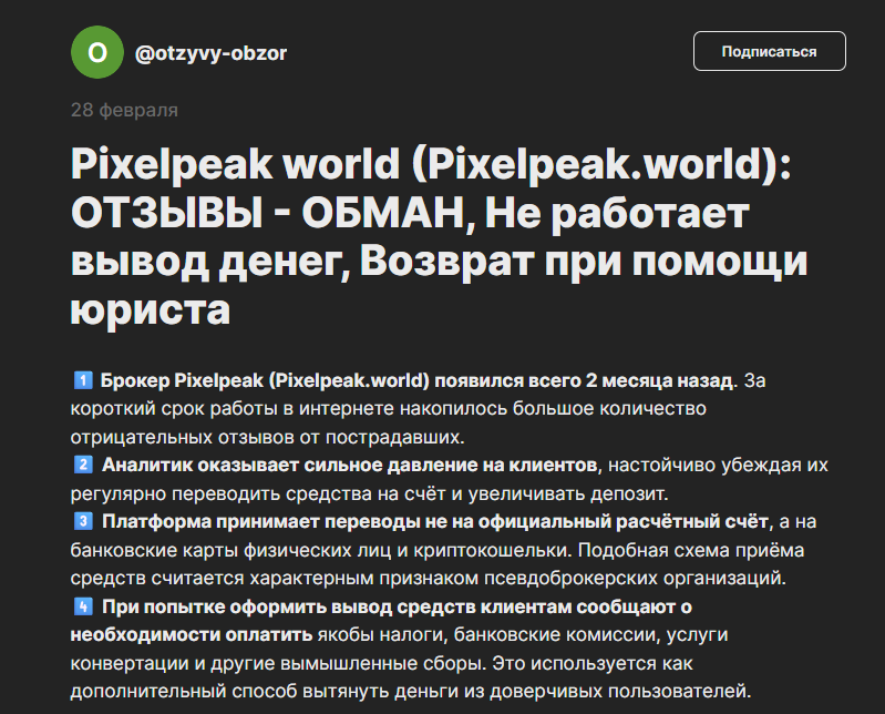 Отзывов о PixelWeak world нет в рамках интернет-порталов для трейдеров или независимых сайтов, так как эта площадка не пользуется спросом у пользователей. В интернете есть лишь одно упоминание о ней, но в рамках обзора с негативным посылом, в которым биржу обвиняют в мошенничестве.