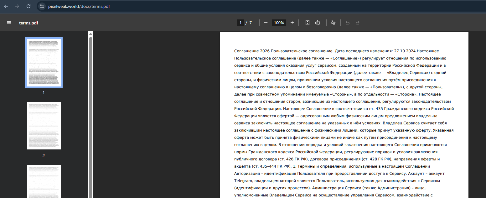 Единственный документ, который можно найти на сайте PixelWeak, – лицензионное соглашение на русском языке, что говорит об ориентации на русскоязычных пользователей и законы РФ, судя по его содержанию.