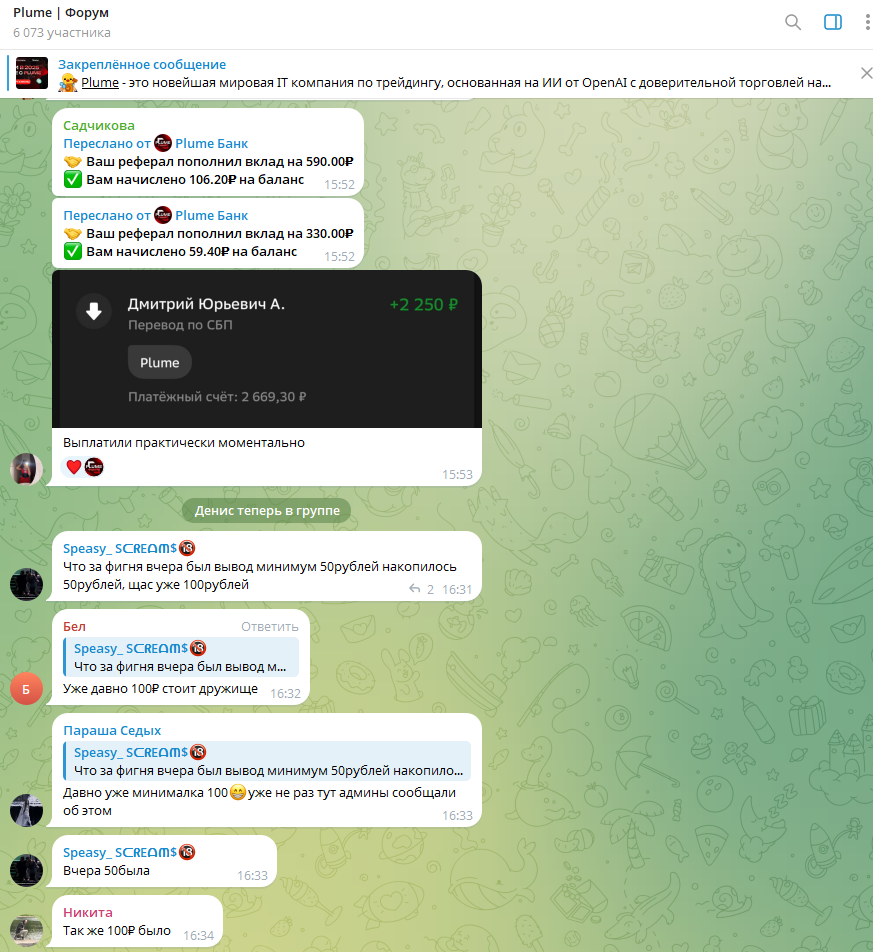 В чате проекта можно встретить немало положительных комментариев, пользователи показывают скрины выплат и делятся своими впечатлениями, но мы подозреваем, что это фейковые аккаунты – такой прием часто используется мошенниками.