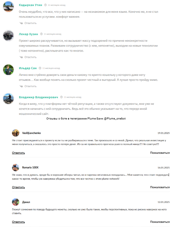 - В сети много негативных отзывов о Plume OneBot, поэтому можно судить о недовольстве инвесторов и проблемах с выводом средств.