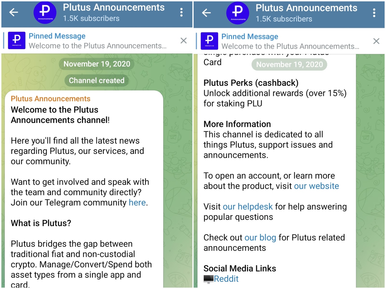 Следить за новостями проекта предлагают с помощью Телеграмм канала Plutus_Announcements. Он работает с 19 ноября 2020 года.
