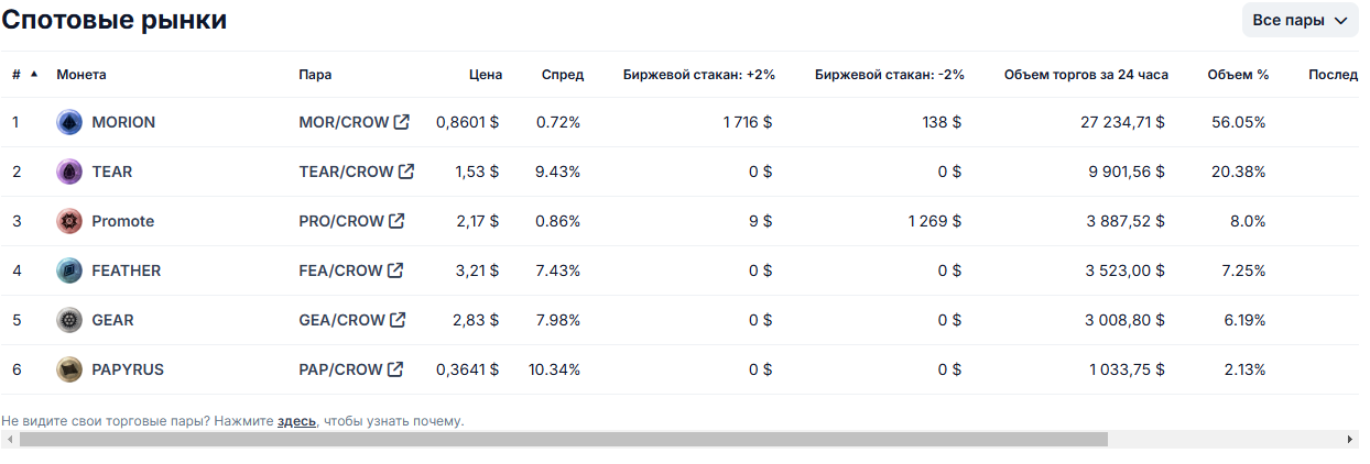 Примерный суточный объем торгов на бирже пока очень маленький — всего около $48 000. Для трейдинга доступно 7 криптовалют и 6 торговых пар. Фиатных валют нет. Самая активная торговая пара — MOR/CROW.