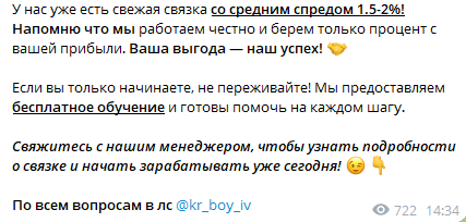 Команда авторов сообщества обещает новичкам наставничество и обучение за процент от прибыли. Точную цену своих услуг создатели паблика не называют: видимо, она обсуждается в личных сообщениях. Всех, кто желает зарабатывать, приглашают в закрытое сообщество. Здесь якобы выкладываются проверенные сигналы и связки.