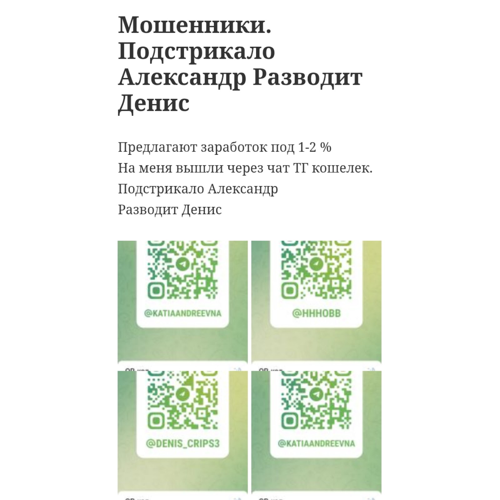 В описании не указаны даже базовые сведения о деятельности. Денис и Александр не рассказывают о своем опыте работы в сфере крипты, а также не демонстрируют верифицированных отчетов, чтобы можно было ознакомиться с их сделками. Анализа крипторынка, каких-либо прогнозов и сигналов в открытом доступе не предоставляют. Также не проводят обучения и не делятся новостями по блокчейну и цифровым валютам. У них отсутствует Телеграмм сообщество, с помощью которого можно было детально узнать о сотрудничестве. Также не оставлены ссылки на другие социальные сети проекта Xxxob.Что касательно совместной работы, то на сегодняшний день известно лишь то, что обещанная прибыль составляла 1-2% за сделку. Однако время зачисления денег не обозначено. В основном потенциальных клиентов ищут через различные тг-каналы и чаты, а затем пишут в личных сообщениях о возможном методе дохода. Сколько нужно отдавать процентов от прибыли, не указано. Также непонятно, нужно ли проходить регистрацию на площадках по промокодам трейдеров.