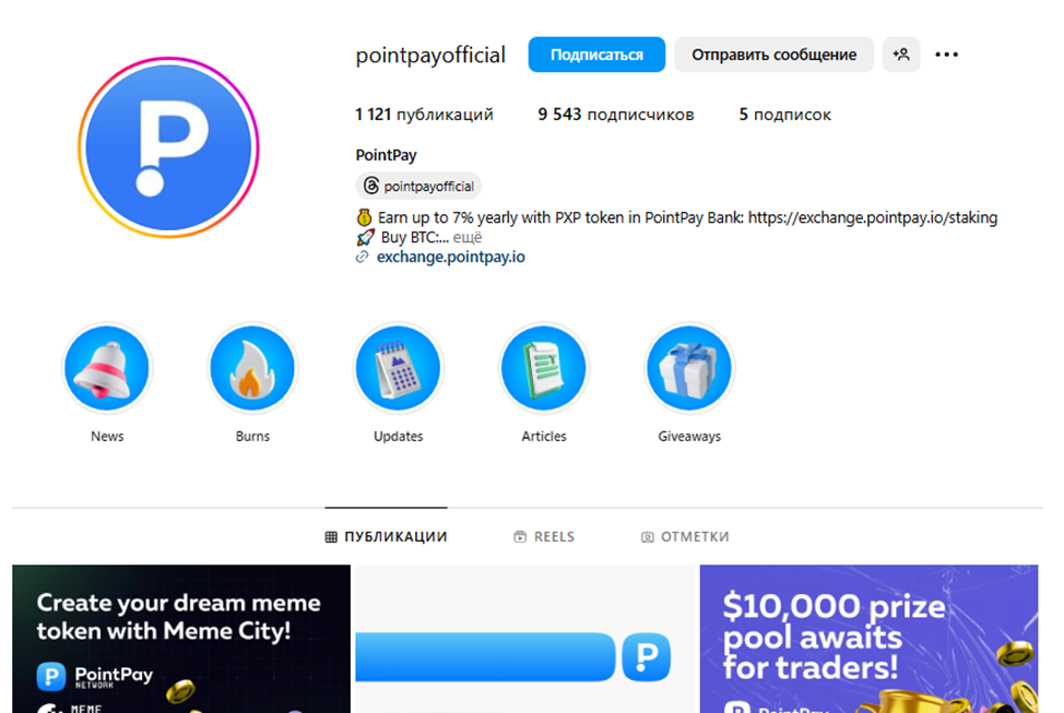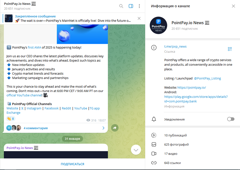 Площадка Exchange PointPay io имеет развитую сеть информационных ресурсов. Новостной канал в Telegram c названием PointPay io News расположен по адресу PXP News. Лента развивается с 4 октября 2023 года, но активный рост подписчиков отмечается с 20 декабря 2024 года. За короткий период ресурс прирос на 15K человек, на 10 февраля 2025 года имел 20,6 тыс. потенциальных клиентов.