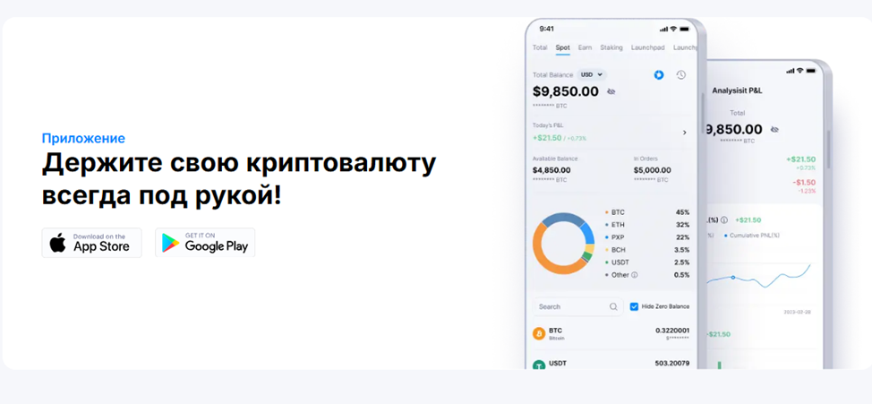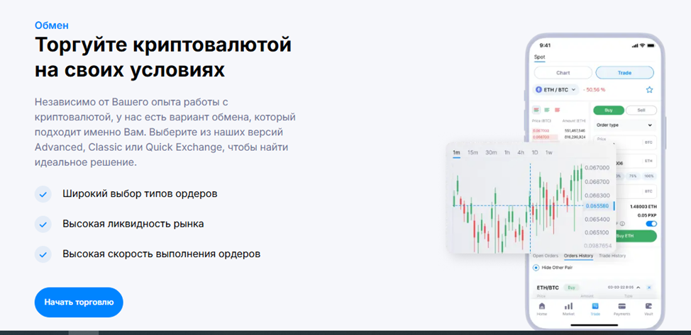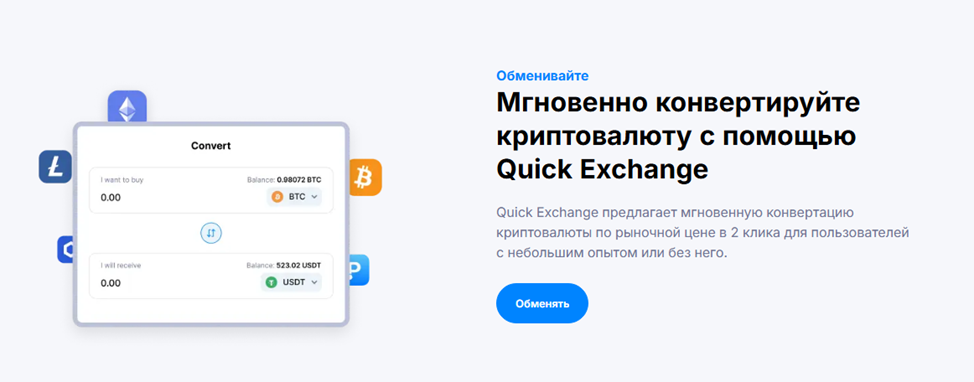 Криптовалютная биржа предлагает три типа интерфейса: Classic, Advanced и Quick Exchange. Такой подход позволяет одинаково комфортно зарабатывать на цифровых активах начинающим и опытным трейдерам. Особенности использования платформы – низкая комиссия, составляющая 0,1% для мейкера и тейкера.