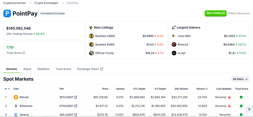 К 2025 году на централизованной бирже торгуется более 172 торговых пар, а активными клиентами платформы является свыше 1 млн человек. По информации площадки CoinGecko, на 10 февраля 2025 года ежедневный оборот «Поинтпей» составлял 140 млн USD.