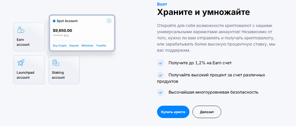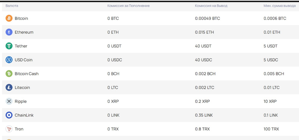 Все финансовые транзакции на платформе осуществляются через единый счет. Пополнение банковскими инструментами производится без комиссии. Вывод обременяется сбором – его сумма зависит от вида крипты.