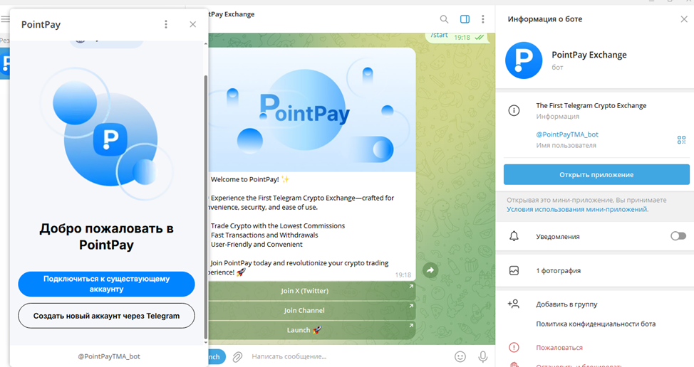 Бот PointPayTMA Bot открывает мини-приложение, где можно торговать активами, не покидая Телеграм. Это отличная альтернатива мобильному приложению и основной площадке Exchange PointPay io, позволяющая отслеживать и оперативно реагировать на все рыночные изменения.