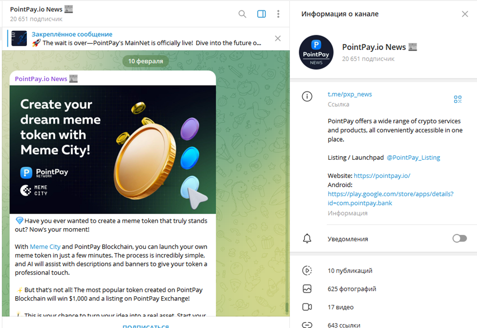 С 10 февраля 2025 года Point Pay в коллаборации с площадкой MemeCity предлагает каждому клиенту создать собственную криптовалюту. Самый популярный мем-токен, созданный на блокчейне «Поинтпей», получит 1000 USD, а также будет официально торговаться на бирже.