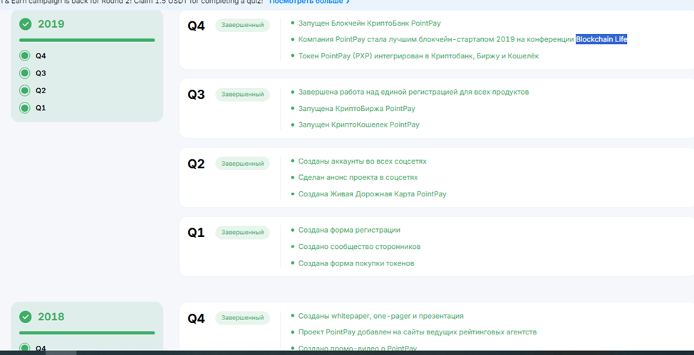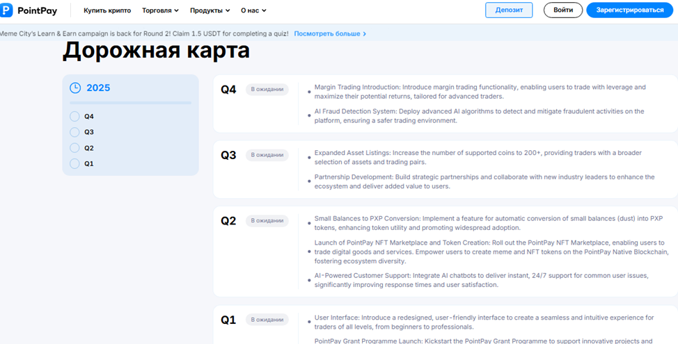 На сайте «Поинт Пай» опубликована подробная дорожная карта на 2025 год. В ближайших планах компании запуск программы грантов, способствующих развитию отрасли, а также NFT-маркетплейса, где можно будет выпускать, торговать цифровыми товарами и услугами, созданными на базе блокчейна PointPay Native.