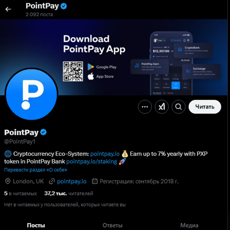 Twitter-аккаунт PointPay1 дублирует информацию из основного телеграм-канала. При 37 тысячах читателей новости смотрит не более 400 человек, что позволяет оценить реальный охват аудитории.