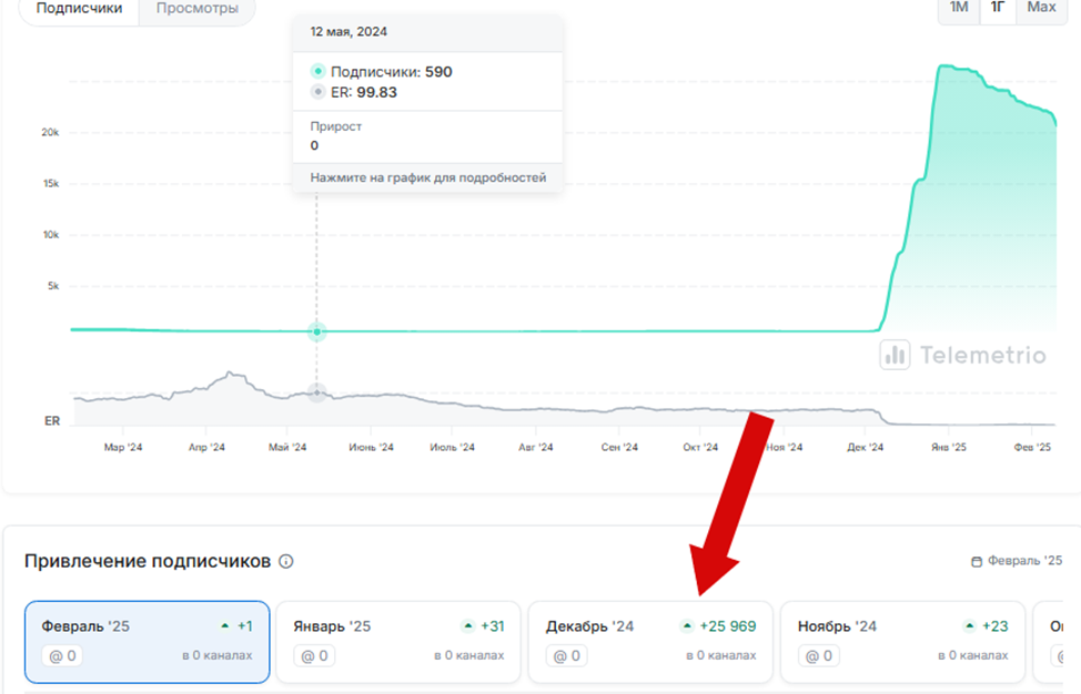 Аномальный интерес аудитории на фоне скромного показателя просмотров постов свидетельствует о искусственной накрутке и низкой популярности основного телеграм-канала.