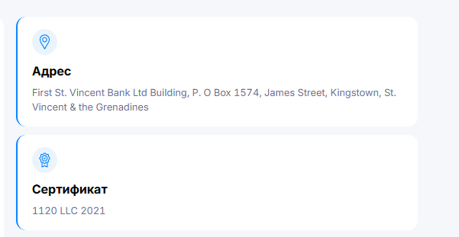 Компания зарегистрирована по адресу First St. Vincent Bank Ltd Building, P. O Box 1574, James Street, Kingstown, St. Vincent & the Grenadines. Регистрация подтверждается сертификатом 1120 LLC 2021.