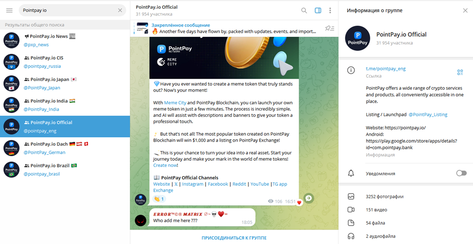 Русская чат-комната имеет 117 подписчиков. Аудитория Pointpay Russia не проявляет интереса к общению. Эту подгруппу не стоит воспринимать как место, где можно получить экспертное мнение о работе платформы.