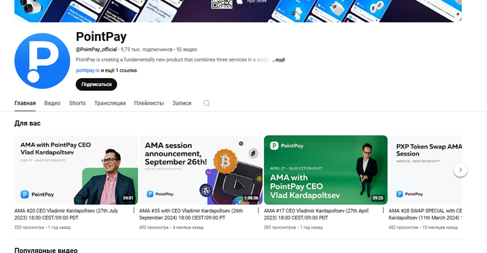 Лицом Ютуб-канала PoiuntPay Official выступает СЕО платформы Владимир Кардапольцев. В шортсах и обычных роликах он рассказывает о новостях биржи, а также делится с 8,75 тыс. зрителей своим видением развития рынка крипты. Видео имеют хорошую аудиторию – в среднем по 10-15 тыс. просмотров. Однако, этот показатель не конвертируется в многочисленные комментарии и лайки.