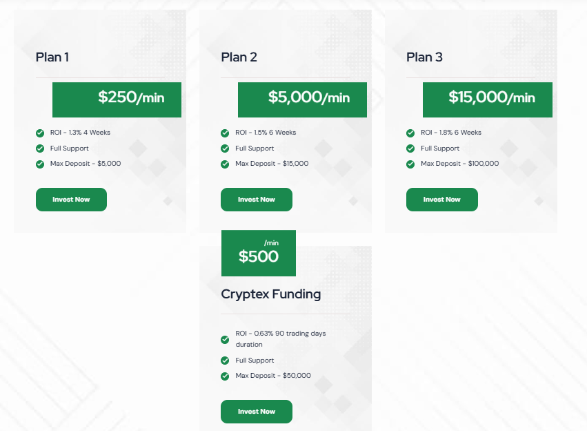 - Cryptex Funding — от 500 баксов до 50 000 долларов под 0,63% в сутки на 90 дней.