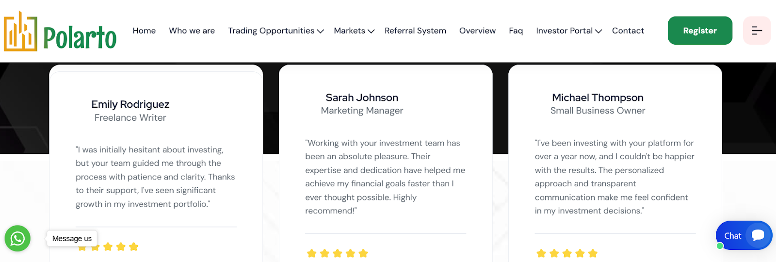 Отзывов о Polarto пока нет, нулевая посещаемость сайта и недавний запуск проекта объясняют их отсутствие. Но сама контора на платформе публикует большое количество заказных отзывов. Доверять им не стоит, они все положительные, восторженные, но фальшивые.