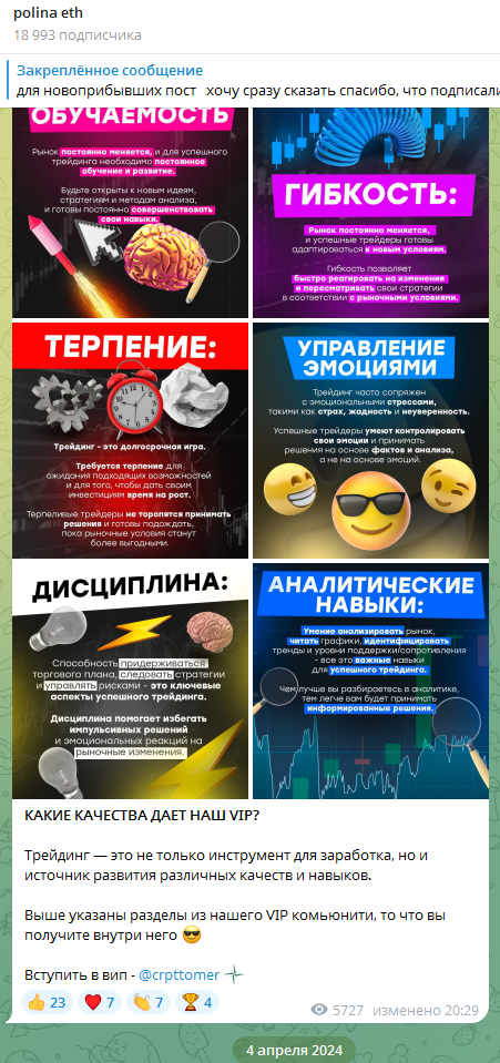 На канале в Телеграме Polina Eth публикуются сигналы для торговли. Опытный трейдер обещает аудитории помогать зарабатывать деньги. Он не является волонтером, поэтому его интересуют финансы подписчиков. Можно ли считать трейдинг с ним успешным – мы сейчас это выясним.