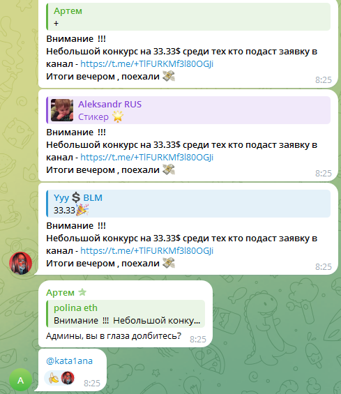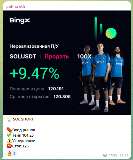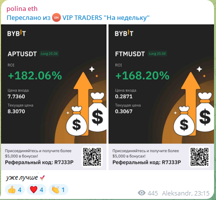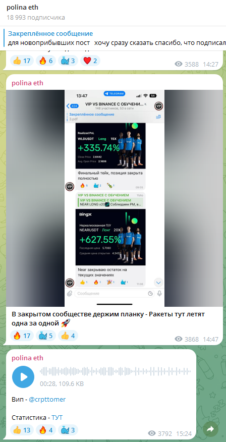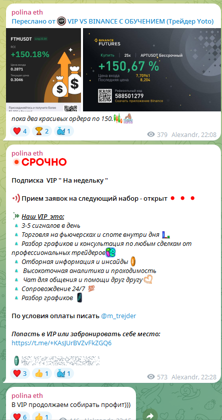 Такого юзера в ТГ тоже уже нет. В группе Телеграм Polina Eth активно распространяется реклама бирж и реферальные ссылки для сделок.Владельцем подразумевается, что результаты торговли участников закрытого сообщества должны мотивировать подписчиков скорее отдать свои деньги.