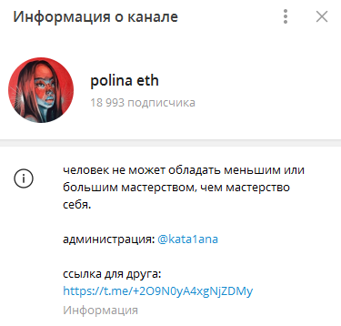 В группу «Полина Етх» входит 18 993 участников. В профиле канала «висит» фраза, придуманная Леонардо да Винчи. Неизвестно, для каких целей успешный трейдер решил процитировать великого художника. О связи канала с торговлей и криптовалютой упоминаний никаких нет. Закреплена только ссылка на аккаунт администратора Kata1ana.