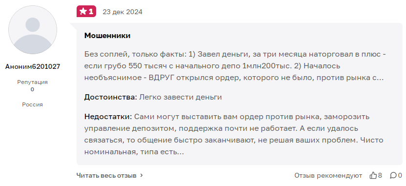 Оказалось, что довольных посетителей этого ресурса нашлось очень мало. Народ разоблачает скам-платформу в мошенничестве. Полина заключила договор с этими аферистами, согласно которому она получает прибыль за убыточные сделки привлеченных лиц. С помощью сигналов трейдер корректирует стратегию подписчиков, чтобы сделки ушли в минус. На отрицательном результате она и зарабатывает. Поэтому мы призываем не связываться с этой мошенницей, коммуникации с ней связаны с риском потерять все свои инвестиции.