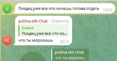 Админ в своих ответах демонстрирует нарушение профессиональной этики, и еще больше портит впечатление о своей компетентности. Администратор отвечает на отзывы подписчиков, используя аккаунт «Полина Етх Чат».