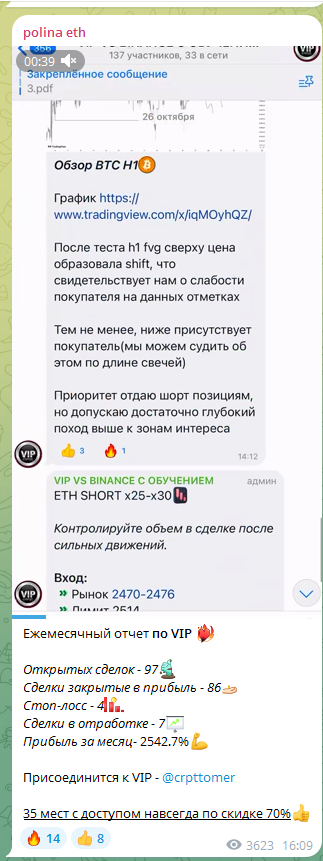 Владелец канала нагло лжет, потому что в постах, опубликованных на этом ресурсе, трейдер рекламирует закрытый канал с сигналами. Для получения доступа к ВИП сообществу, необходимо написать пользователю с ником Crpttomer.