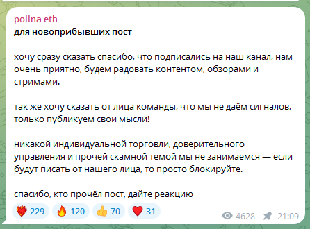 - статистики собственного участия в рыночных сделках владелец канала не публикует;