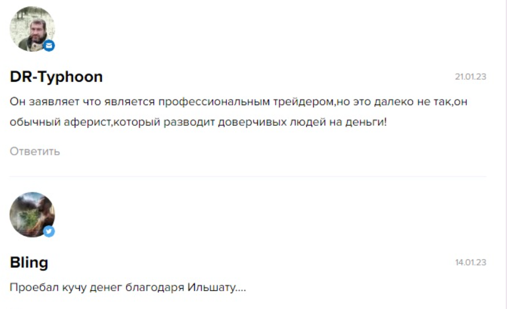 На сторонних сервисах в отзывах об «Обучении трейдингу на бирже от трейдера Ильшата Байтурина» люди жалуются, что автор школы является мошенником. Один из клиентов пишет, что потерял много денег из-за инвестора.