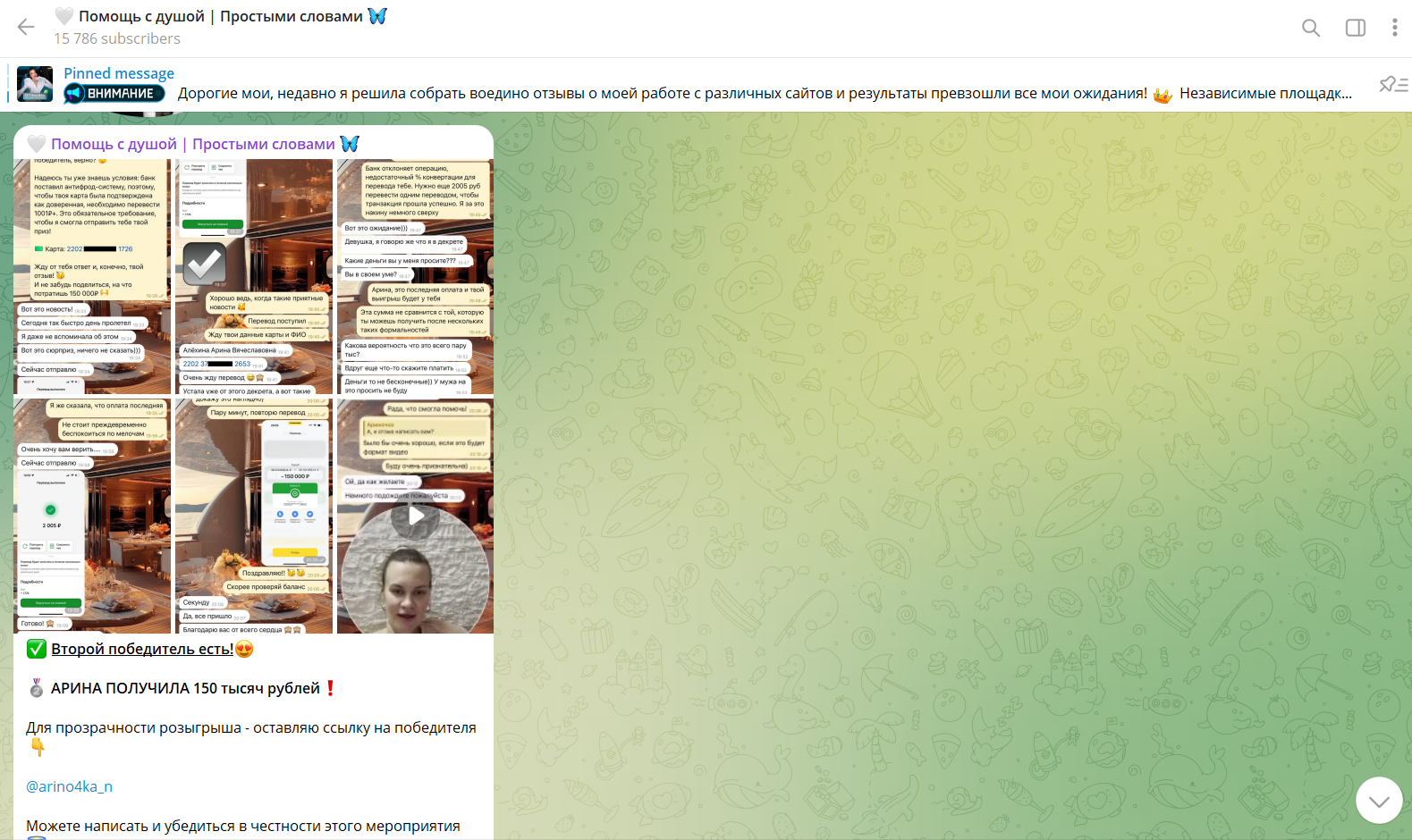 «Помощь с душой простыми словами» – телеграм-канал девушки по имени Валерия. Автор канала регулярно проводит розыгрыши крупных сумм денег, обычно по 450-500 тысяч за раз. Пользователи могут выиграть от 100 до 200 тысяч рублей. При этом им не нужно ничего оплачивать и покупать. Верится в это с трудом, поэтому в статье мы разберем, что кроется за предложениями Валерии, на самом ли деле она занимается благотворительностью или «Помощь с душой простыми словами» – развод.