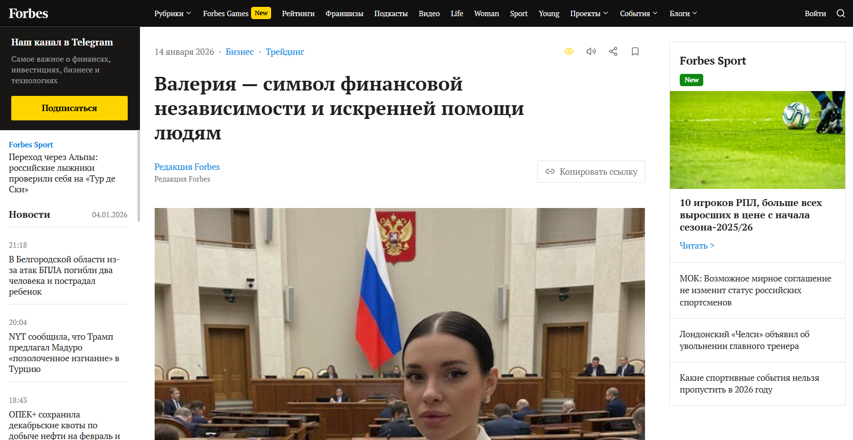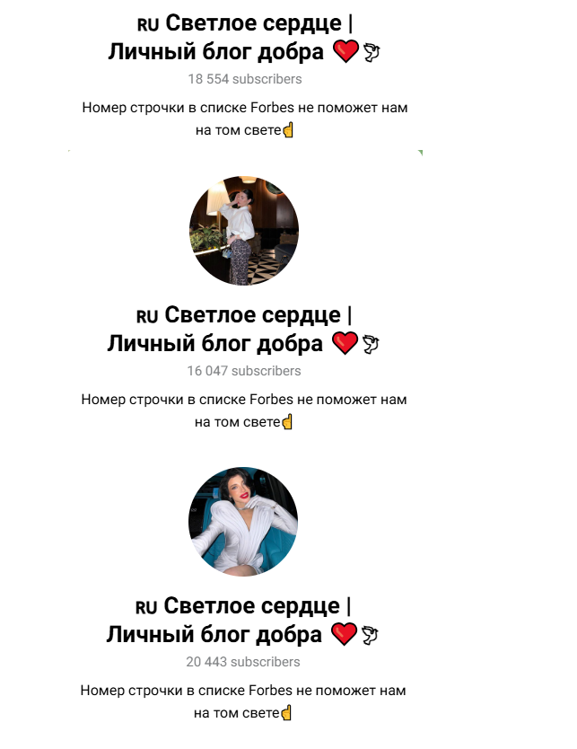 В канале есть закрепленное сообщение, в котором девушка указывает ссылки на отзывы и статьи о себе и своем проекте. Во всех статьях хвалят ее благотворительность. Более того, здесь есть даже ссылка на якобы журнал Форбс, где размещена статья о Валерии. Согласно данному материалу, девушка давно занимается благотворительностью, раздает людям деньги посредством розыгрышей в телеграм-канале. Можно было бы в это поверить, но стоит только попробовать перейти в любую другую вкладку на странице, становится понятно, что это муляж, поскольку ни одна ссылка не работает.