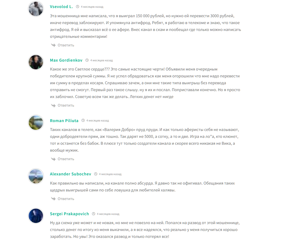 В ленте канала можно увидеть сообщения, где Валерия пишет: победитель уже найден и сообщает, что знает об антифрод-системе. Это уже вызывает подозрения, поскольку это излюбленный прием мошенников. Тем самым победителям они в дальнейшем объясняют, что крупный перевод не пройдет из-за того, что ранее на эту карту деньги не отправлялись. Якобы в банке срабатывает система антифрод, которая просто блокирует операцию. Чтобы ее обойти, необходимо просто сделать небольшой входящий перевод. То есть пользователь должен отправить Валерии небольшую сумму, размер ее девушка называет сама. Как правило, она составляет несколько тысяч рублей. После этого Валерия сможет вернуть полученные деньги, ну и перечислить сумму выигрыша. Многие верят мошенникам и переводят деньги, но никакого выигрыша, разумеется, не получают. Пользователя просто заносят в черный список после оплаты.