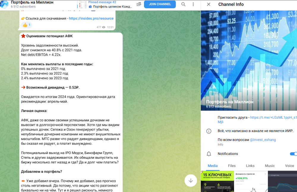 Портфель на Миллион — это Телеграмм сообщество, посвященное аналитике фондового рынка, а также новостям из данной сферы. Основатель блога обещает информировать о собственном инвестиционном портфеле, но платных услуг аудитории не предлагает. В обзоре мы расскажем про канал детальнее.