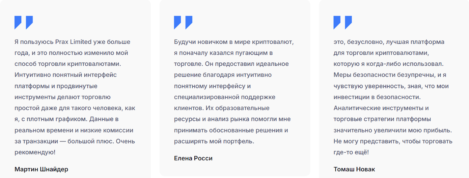 О бирже высказываются неоднозначно. На сайте praxlimited com опубликованы положительные отзывы. Их авторы заявляют, что образовательные материалы помогли им научиться принимать обоснованные решения. Также отмечают низкие комиссии, полезные аналитические инструменты, безопасность и возможность хорошо зарабатывать. Но нет гарантии, что эти комментарии написаны реальными клиентами, а не фейк. Связаться с их авторами невозможно, ссылок на профили и фотографий нет.