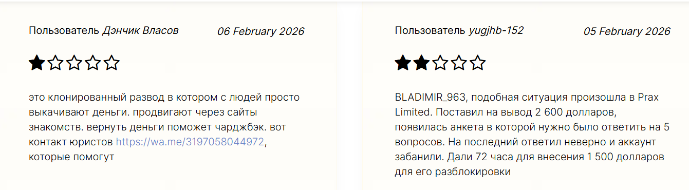 На независимых сайтах о Praxlimited были найдены исключительно негативные отзывы. Платформу называют клонированным разводом. Жалуются на невозможность вывода денег. При подаче заявки на выплату транзакцию замораживают и просят пройти анкетирование. В случае неверного ответа на вопрос аккаунт блокируют и для открытия доступа к нему требуют внести 1500 долларов. Ниже примеры таких отзывов: