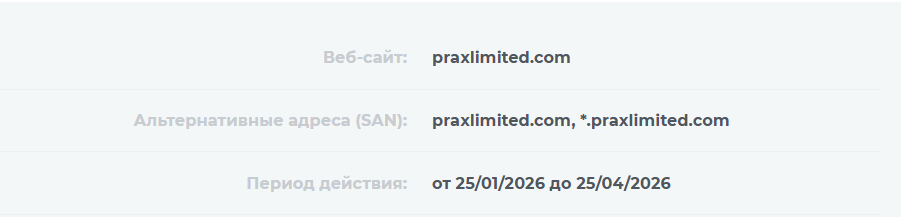 На сайте биржи Prax Limited заявлено, что она работает легально, при этом не указаны серия и номер лицензии. Не приведена история компании. Но удалось выяснить, что площадка была создана совсем недавно — 25 января 2026 года. Имя директора организации и штат сотрудников неизвестны.