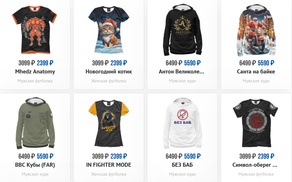 Лоты, доступные к покупке, представлены на сайте. Например, футболки стоят ₽2, 399, а худи – ₽5,990.