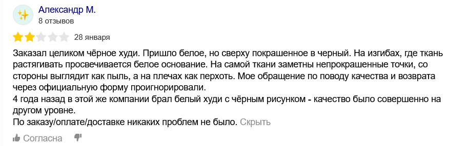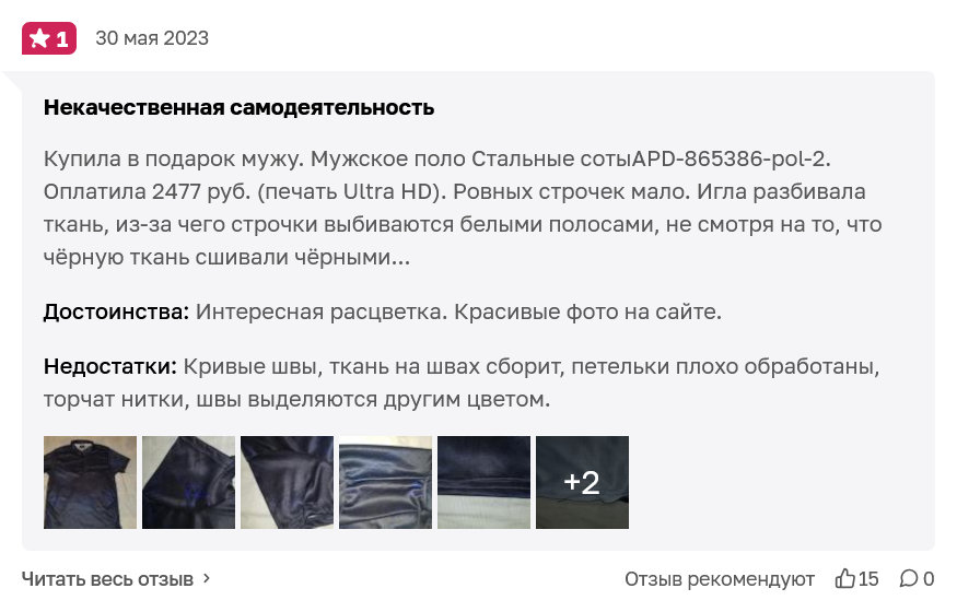 Также в своих отзывах о «Принт Бар» покупатели указывают на отвратительное качество материала, неровные строчки при прошивке, плохую обработку петель и торчащие нитки.