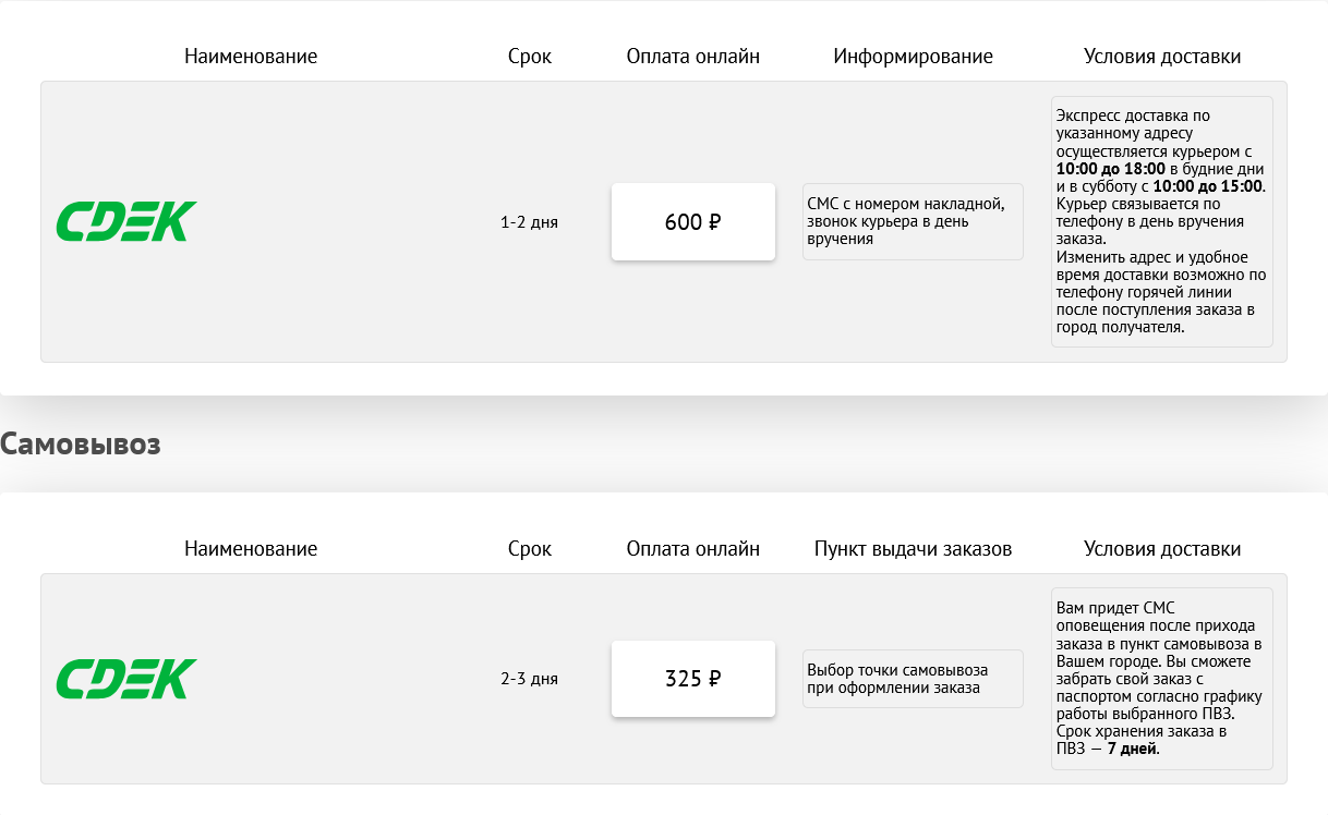 Доставку обещают в течение 48 часов с момента оплаты транспортной компанией Cdek либо в пункт выдачи, либо на дом покупателю.