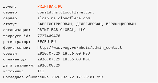 Об основателях компании данных никаких нет. Нельзя установить, работает ли фирма в рамках закона, зарегистрирована ли официально в ФНС и прочих ведомствах. Веб-страницу интернет-магазина «ПринтБар ру» зарегистрировали в 2010 году, оплата действительна до июля 2026.