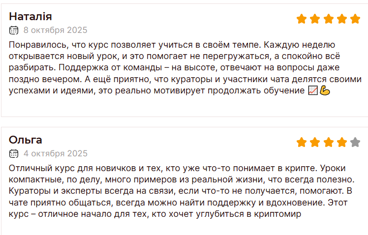 Катя Крипто получила тысячи отзывов. Конечно, самых разнообразных. В хороших пишут, что ее курсы отлично подходят для новичков, что можно учиться в своем темпе, что дает примеры из реальной жизни.