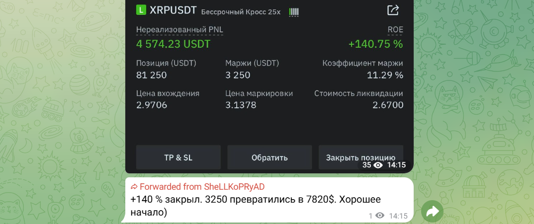 Кроме того, телеграмм-канал profit zone часто публикует результаты своей торговли. Например, в этом посте автор пишет, что получил +140% к своему депозиту за одну сделку на XRP/USDT.
