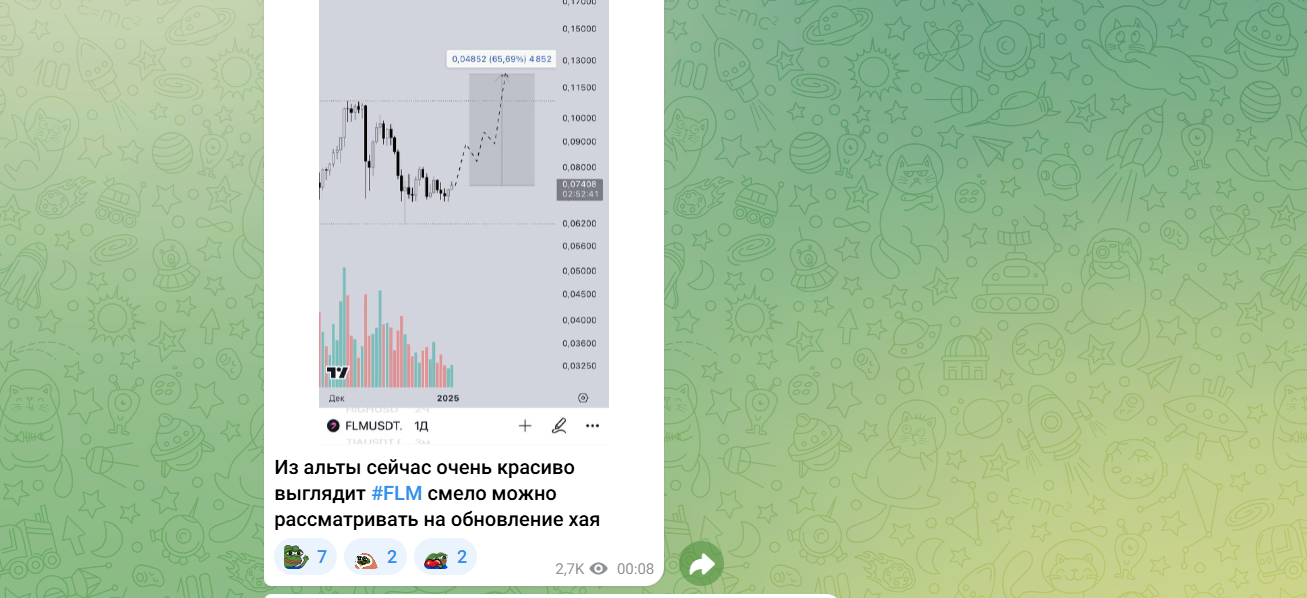 Основной тип контента здесь — сигналы на альткоины. Например, в этом посте автор предлагает купить FML, обещая, что цена монеты должна вырасти в ближайшее время. Однако никаких доказательств этого нет. Автор просто показал скрин графика и нарисовал пунктирной линией предполагаемый тренд.