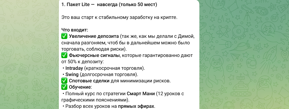 Есть два тарифа — Lite и Profit. В тарифе Lite клиент получает разгон депозита и доступ в закрытый чат с сигналами как для спотового, так и для фьючерсного рынка. В Premium пакете есть тоже самое, что и в Lite, плюс индивидуальное обучение и консультации.