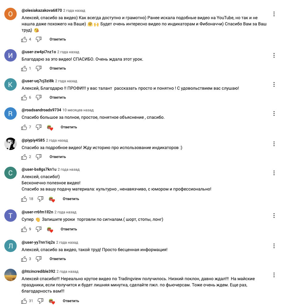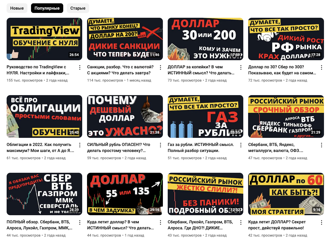 Самый популярный ролик был воспроизведен более 150 тысяч раз. Он посвящен обучению TradingView. Однако, в основном, ролики на канале получают несколько меньше внимания. Так, в среднем, выпуски на канале просматриваются 10-20 тысяч раз.