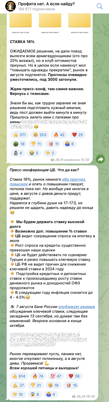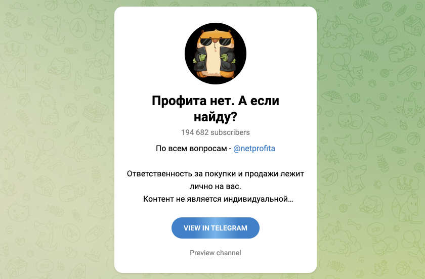 Основная масса контента на ТГ-канале «Профита нет» – это новости российского финансового рынка. Автор анализирует тенденции и делает на основании полученной информации прогнозы.