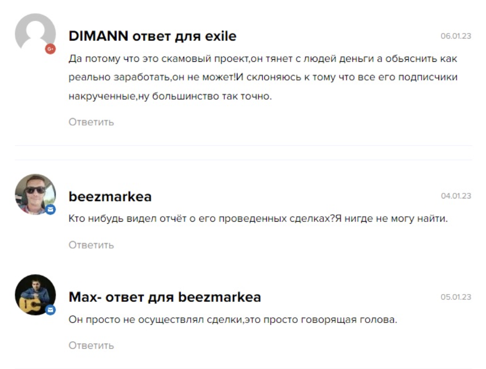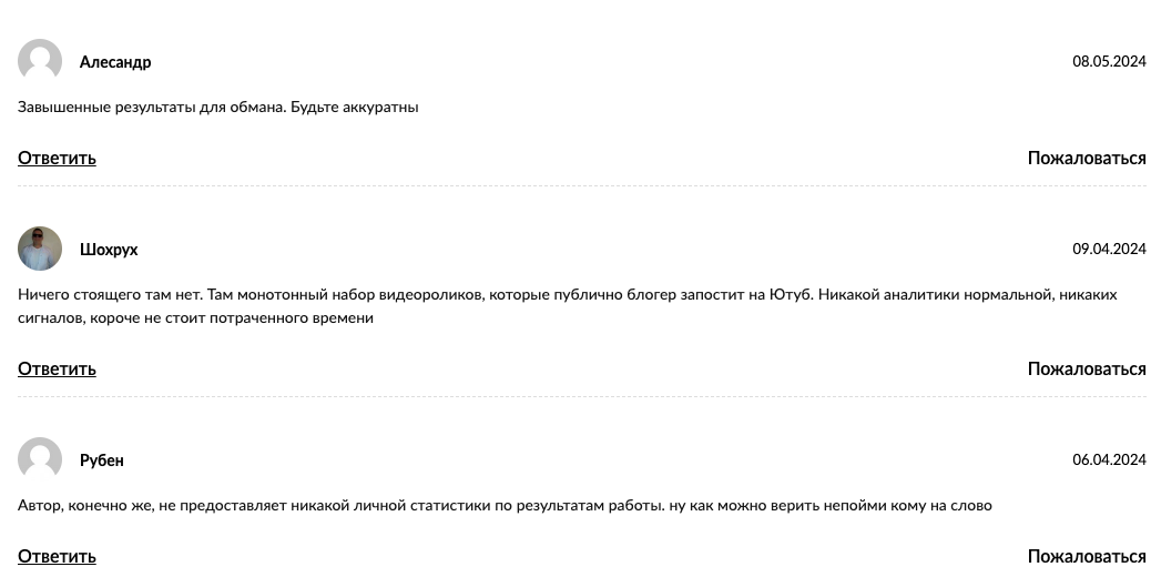 Люди утверждают, что админ совершенно не демонстрирует результативность своих торговых сделок. Он не показывает ни статистики, ни отдельных результатов той или иной своей сессии на бирже.