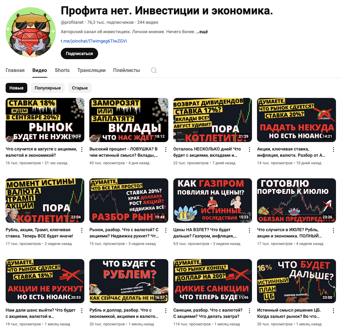 Помимо телеграмм-канала «Профита нет Инвестиции и экономика», у автора проекта есть и аккаунт на YouTube. На него подписано около 76 тысяч человек.