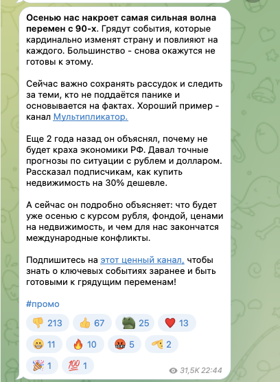 Зато автор проекта довольно регулярно размещает рекламу. В основном, он продвигает сторонние телеграмм-каналы. При этом, очевидно, тексты для соответствующих публикаций админ пишет не сам – ему их подготавливают.